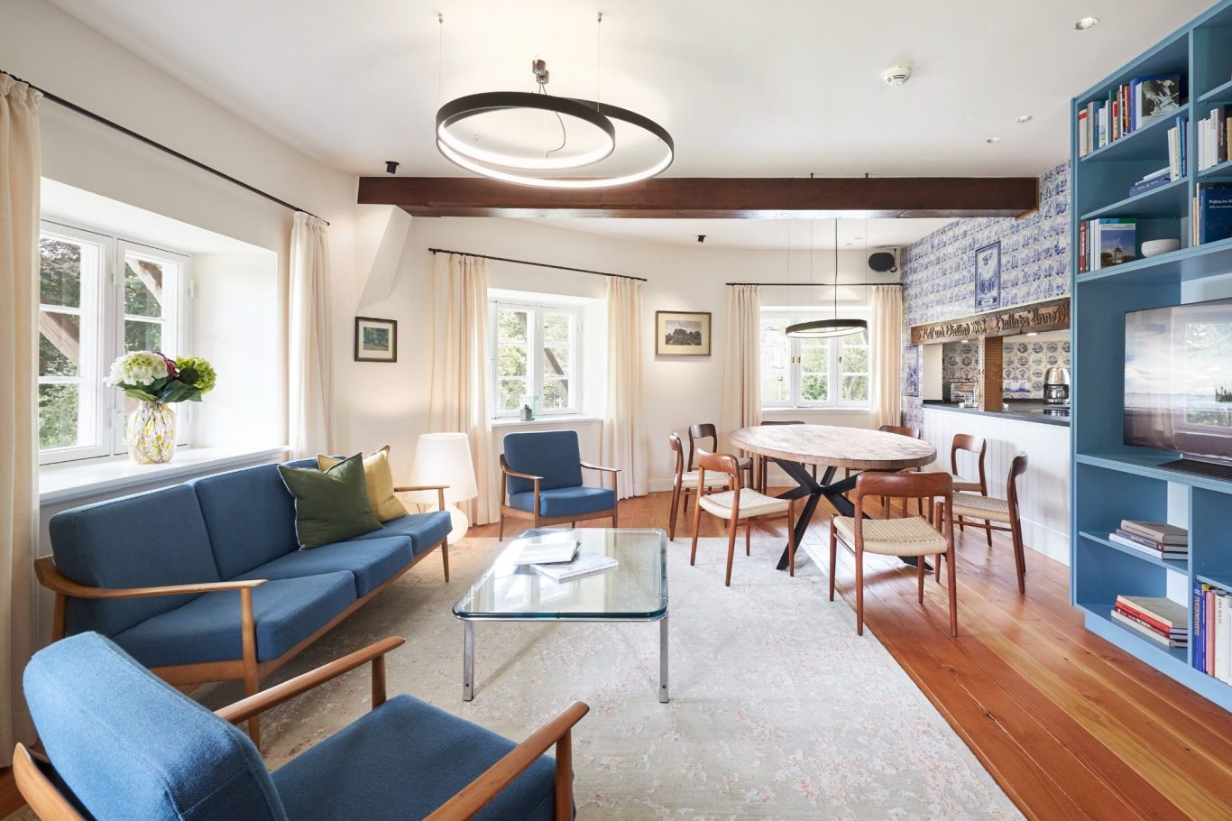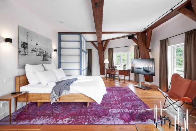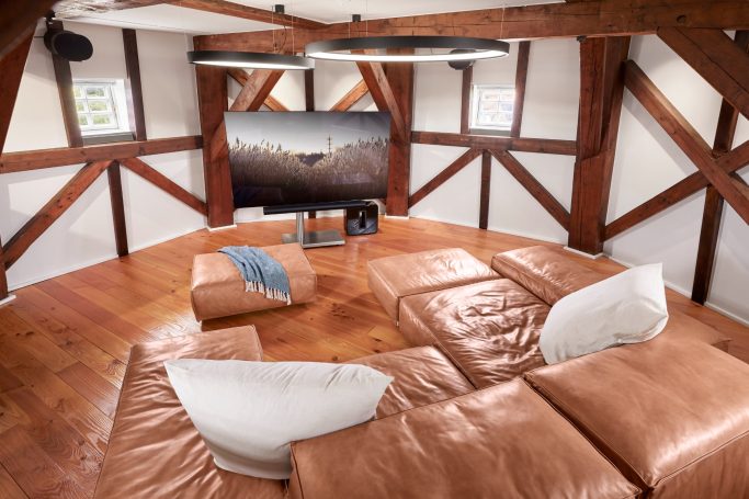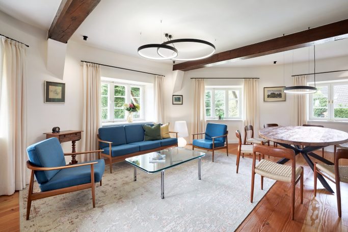 Der achteckige Grundriss und das sich nach oben verjüngende Mühlengebäude machen rechte Winkel selten und verleihen jedem Raum seinen ganz besonderen Charme. Vintage-Möbel und ausgewählte Design-Objekte sorgen in Kombination mit modernster Haustechnik für Komfort.